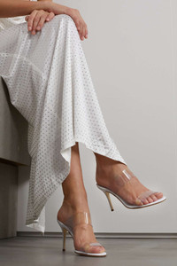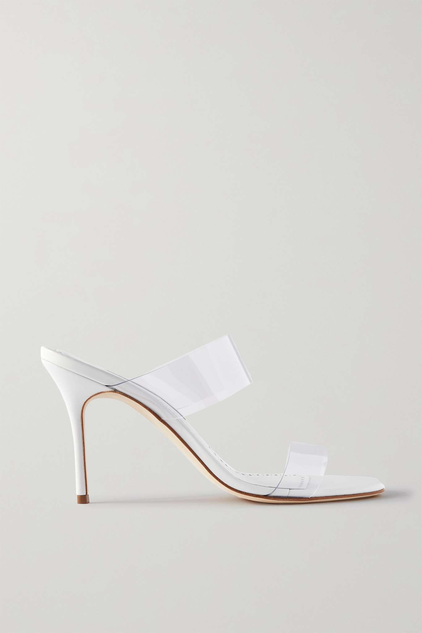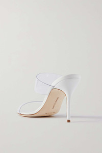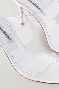 EDITORS'NOTES Manolo Blahnik's versatile mules have two clear PVC straps that create an elongating effect. They're set on white leather footbeds with stiletto heels. Wear yours with anything from jeans to mini dresses. SIZE & FIT - Fits true to size, take your normal size - Italian sizing DETAILS & CARE - Heel measures approximately 90mm/ 3,5 inches - Clear PVC - Slip on Small to size. See Size & Fit notes.