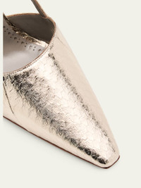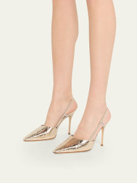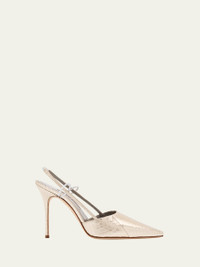 Crafted from metallic snakeskin, the "Touki" pumps by Manolo Blahnik feature contrasting looped strap accents 4.25 in / 105 mm covered stiletto heel Pointed toe Elastic slingback strap Goat leather lining Leather outsole Made in Italy This item cannot be sold or shipped to California. Online Inquiries: BGS21_X6ZET| Store Inquiries: #5070380