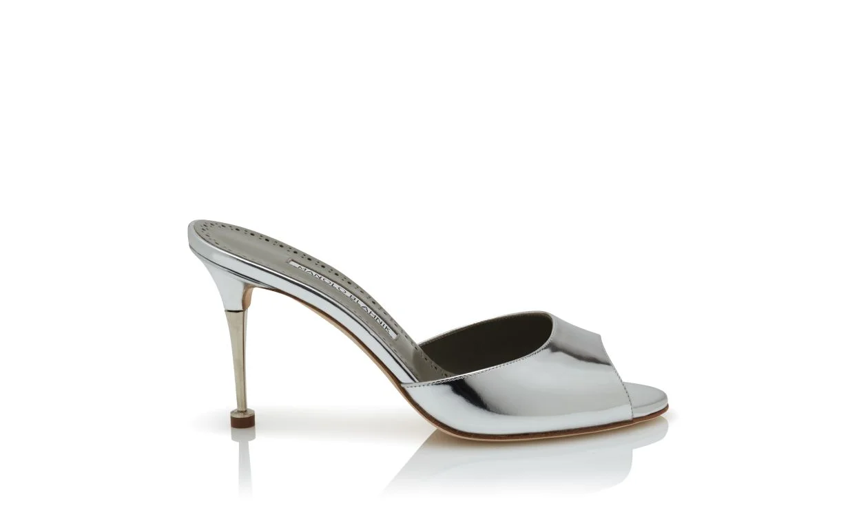 Silver calf leather open toe mules featuring a stiletto high heel in a palladium finish. Upper:100% calf leather.Sole:100% calf leather.Lining:100% kid leather.Heel measures:90 mm.Italian sizing. Made in Italy. Product ID: 425-2101-0001