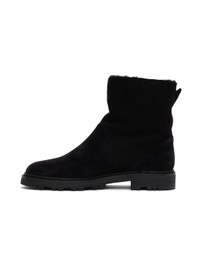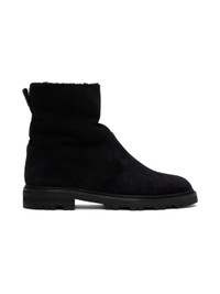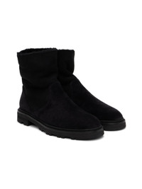 Handcrafted ankle-high kidskin suede boots in black. · Pull-loop at heel · Shearling lining · Stacked calfskin midsole · Treaded rubber sole Supplier color: Black Upper: kidskin. Sole: calfskin, rubber. Made in Italy 242140F113002