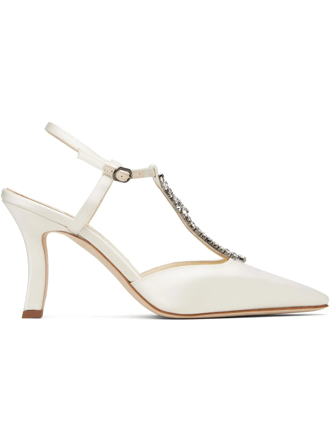 Handcrafted satin heels. · Pointed toe · Crystal-cut appliques at vamp · Pin-buckle ankle strap · Grained leather lining · Covered stiletto heel with rubber injection · Nubuck sole · Heel: H3.25" Supplier color: Cream Upper: textile. Sole: leather. Made in Italy 252140F122028