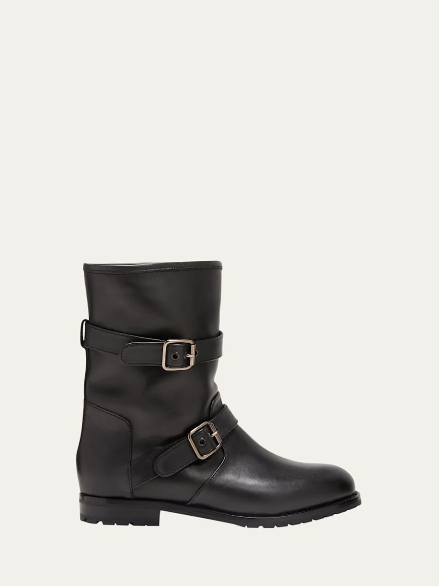 Manolo Blahnik "Sulaltra" calf leather biker booties Buckle straps at ankle and collar 0.25 in / 10 mm flat heel Round toe Side zip eases dress Leather outsole Lining: Leather Made in Italy