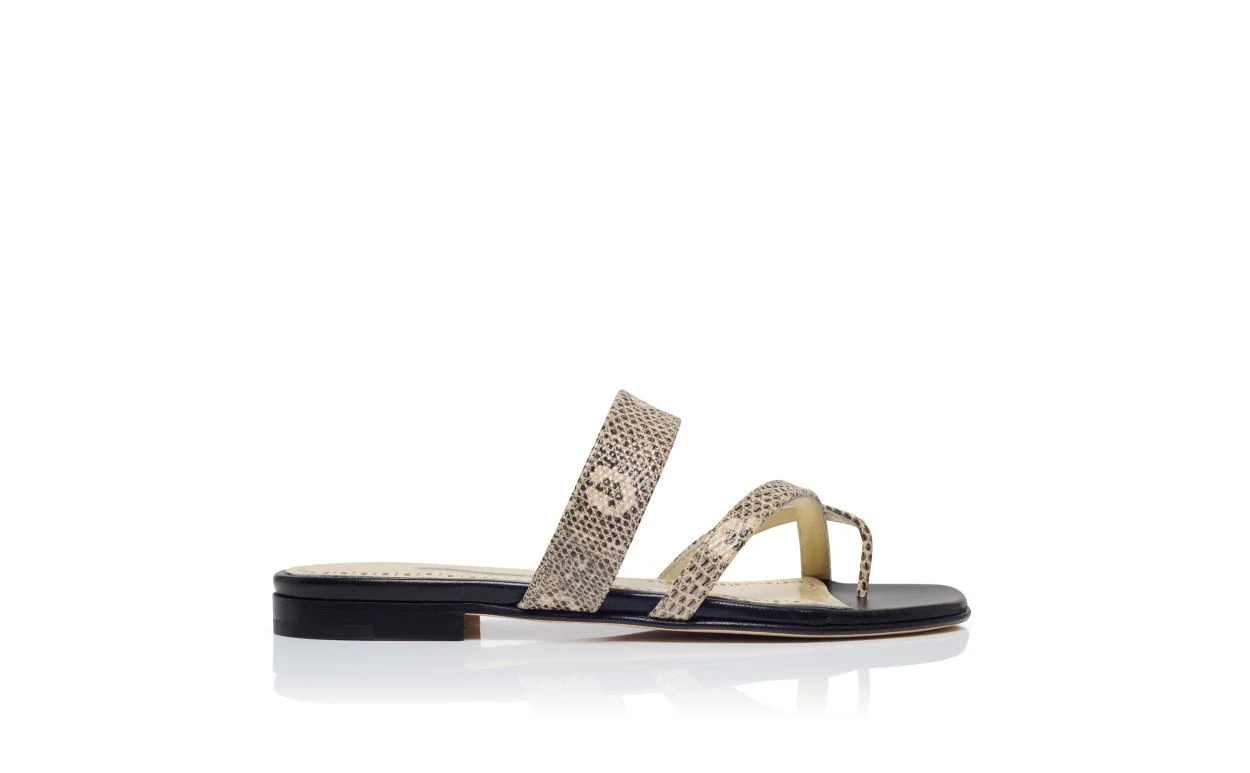 Black and light beige calf leather open toe flat sandals featuring lizard print detailing, crossover front straps with toe stem and instep strap. Finished with a flat stacked heel. Upper:100% calf leather.Sole:100% calf leather.Lining:100% kid leather.Heel measures:10 mm.Italian sizing. Made in Italy. Product ID: 425-2262-0001