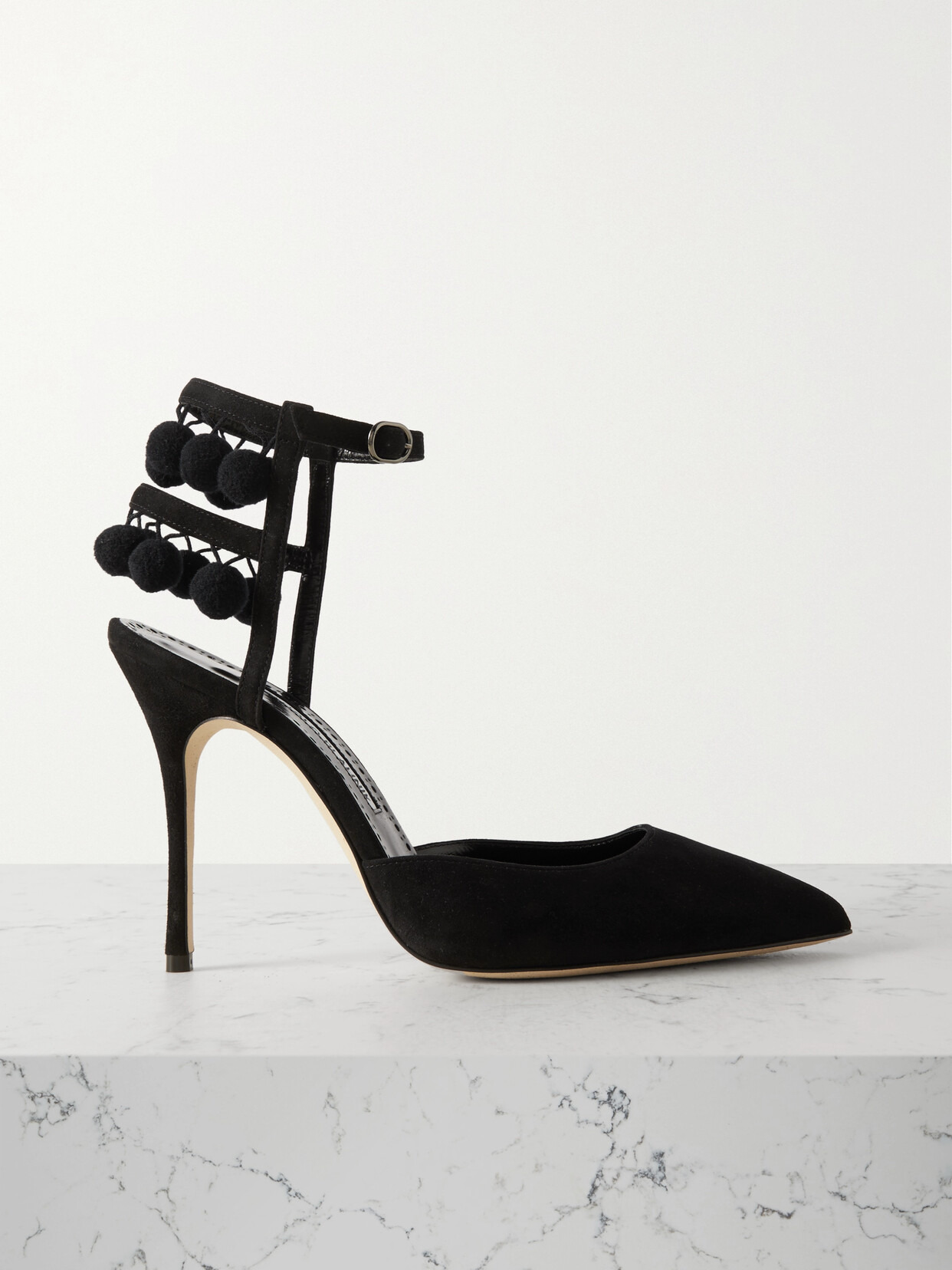 Elegant with a playful twist, Manolo Blahnik's 'Tumusami' pumps are embellished with rows of pom-poms at the ankle that create unexpected movement with every step. They're crafted from supple black suede with sleek pointed toes and slender 105mm stiletto heels. Wear yours with mini dresses and cropped tailoring to showcase the detail.