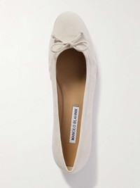 EDITORS'NOTES The ballet flat is officially back. Manolo Blahnik's pair has been made in Italy from soft suede and is detailed with rounded toes topped with a bow. Slip yours into your tote - you might need them after a day in heels. SIZE & FIT - Fits true to size, take your normal size - Those with narrow feet may wish to take the next size down - Italian sizing DETAILS & CARE - Heel measures approximately 10mm/ 0.5 inches - Cream suede (Goat) - Slip on