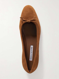 EDITORS'NOTES The ballet flat is officially back. Manolo Blahnik's pair has been made in Italy from soft suede with softly rounded toes topped with a bow. Slip yours into your tote – you might need them after a day in heels. SIZE & FIT - Fits true to size, take your normal size - Those with narrow feet may wish to take the next size down - Italian sizing DETAILS & CARE - Heel measures approximately 20mm/ 1 inch - Brown suede (Kid and Cow) - Slip on