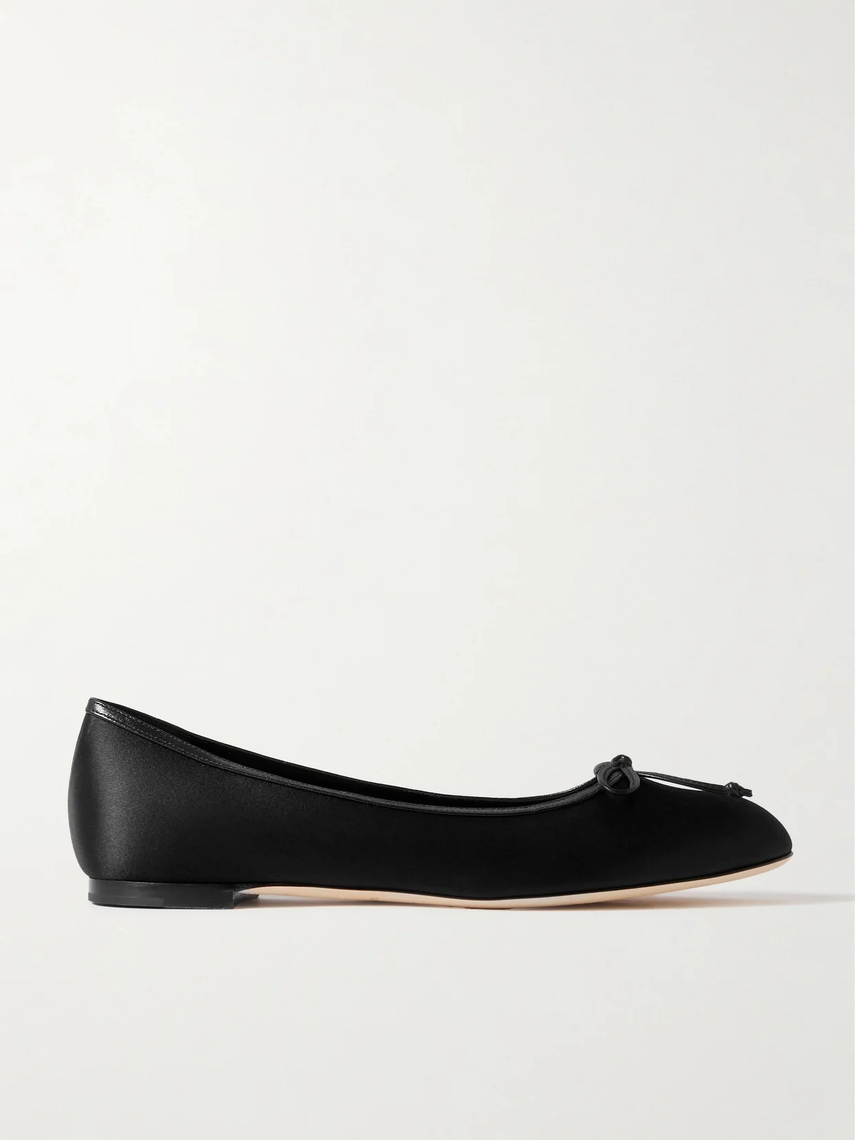 Manolo Blahnik's ballet flats have been made in Italy from smooth satin traced with leather. Topped with dainty bows, they have rounded toes and slight heels for subtle lift.