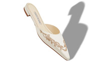 White satin pointed toe flat mules featuring embroidered gold cascading leaf design. Finished with flat stacked heel Upper:72% viscose, 28% silk.Sole:100% calf leather.Lining:100% kid leather.Heel measures:10 mm.Italian sizing. Made in Italy. Product ID: 325-3004-0001