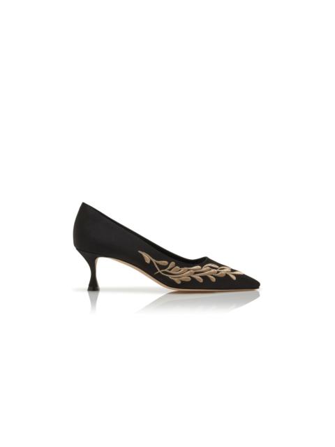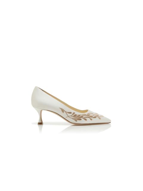 White satin pointed toe pumps featuring embroidered gold cascading leaf design. Finished with flared low heel. Upper:72% viscose, 28% silk.Sole:100% calf leather.Lining:100% kid leather.Heel measures:50 mm.Italian sizing. Made in Italy. Product ID: 325-3003-0004