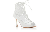 White calf leather open toe boots featuring laser cut design, lace-up detail and stiletto high heel. Upper: 100% calf leather. Sole: 100% calf leather. Lining: 100% kid leather. Heel measures 90mm. Italian sizing. Made in Italy. Product ID: 223-1415-0001