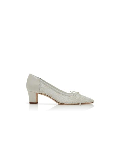 White lace almond toe pumps featuring bow detail and a low block heel. Upper:90% fabric, 10% silk.Sole:100% calf leather.Lining:100% kid leather.Heel measures:50 mm.Italian sizing. Made in Italy. Product ID: 425-2106-0002