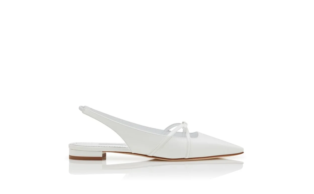 White patent leather pointed toe flat pumps featuring bow detail, elasticated slingback design and flat stacked heel. Upper: 100% patent calf. Sole: 100% calf leather. Lining: 100% kid leather. Heel measures 10 mm. Italian sizing. Made in Italy. Product ID: 225-1825-0004