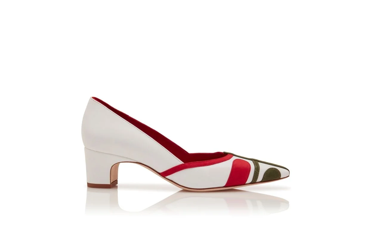 White nappa leather pointed toe pumps featuring red and green suede design details and low block heel. Upper: 90% lamb nappa, 10% kid suede. Sole: 100% calf leather. Lining: 100% kid leather. Heel measures 50 mm. Italian sizing. Made in Italy. Product ID: 225-1858-0001
