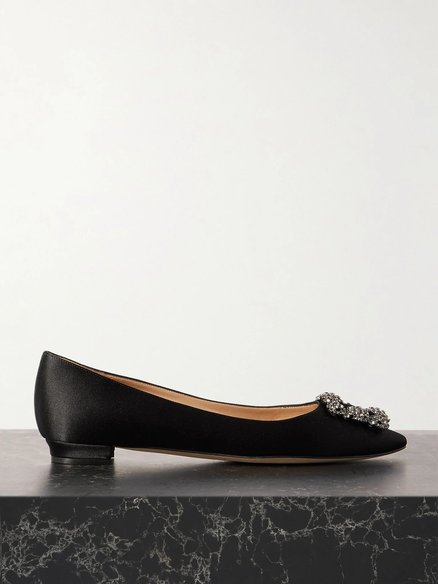 Manolo Blahnik discovered the beautiful crystal-embellished buckle (that's become nothing short of iconic) in Italy, where his designs are also meticulously crafted. These 'Hangisi' flats are made from lustrous black satin with leather linings and soles. Take a cue from stylist and influencer Emili Sindlev who likes to match the shade of her Manolo's to her accessories. Size & Fit - Fits large to size, take a half size smaller than normal - Italian sizing Details & Care - Heel measures approximately 10mm/ 0.5 inches - Black satin - Slip on - Made in Italy