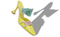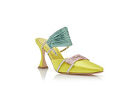 Yellow satin closed toe mules featuring contrasting pink and teal gathered straps with decorative crystal buckle attachments. Finished with a flared high heel. Upper: 72% viscose, 28% silk. Sole: 100% calf leather. Lining: 100% kid leather. Heel measures 90mm. Italian sizing. Made in Italy. Product ID: 323-2479-0001
