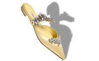 Cream satin pointed toe mules featuring crystal embellishment, instep strap with crystal embellishment and flat stacked heel. Upper: 72% viscose, 28% silk. Sole: 100% calf leather. Lining: 100% kid leather. Heel measures 10 mm. Italian sizing. Made in Italy. Product ID: 122-1947-0017