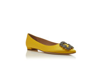 Yellow satin almond toe flat shoes finished with a square crystal buckle encased in a gunmetal frame. Upper: 72% viscose, 28% silk. Sole: 100% cow leather. Lining: 100% goat skin. Heel measures 10mm. Italian sizing. Made in Italy. Product ID: 9XX-0348-0048