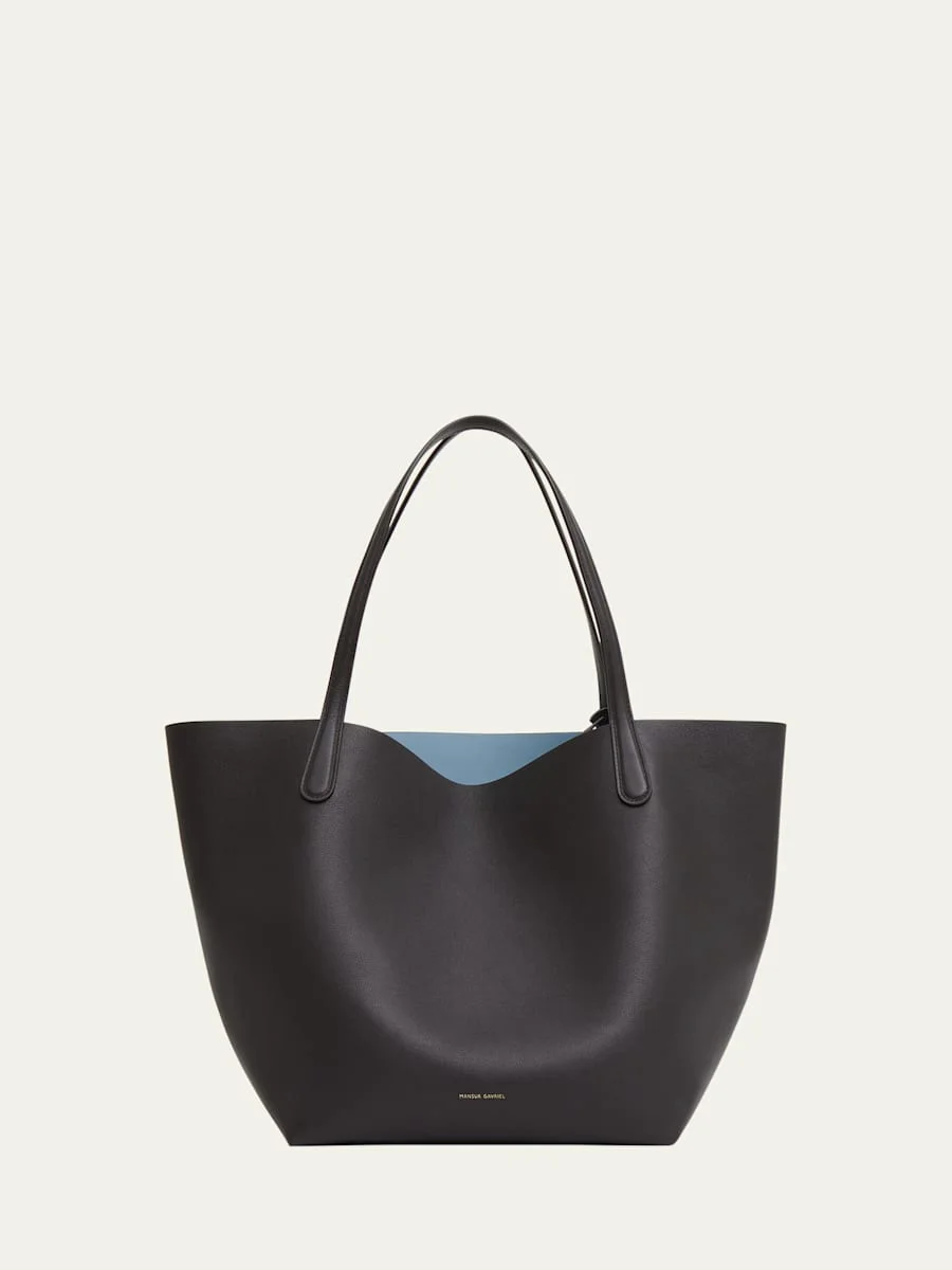 Mansur Gavriel tote bag in soft calf leather Flat shoulder straps Open top with selftie closure Interior, leashed zip pouch bag Approx. 11.8"H x 21.5"W x 9"D Made in Italy