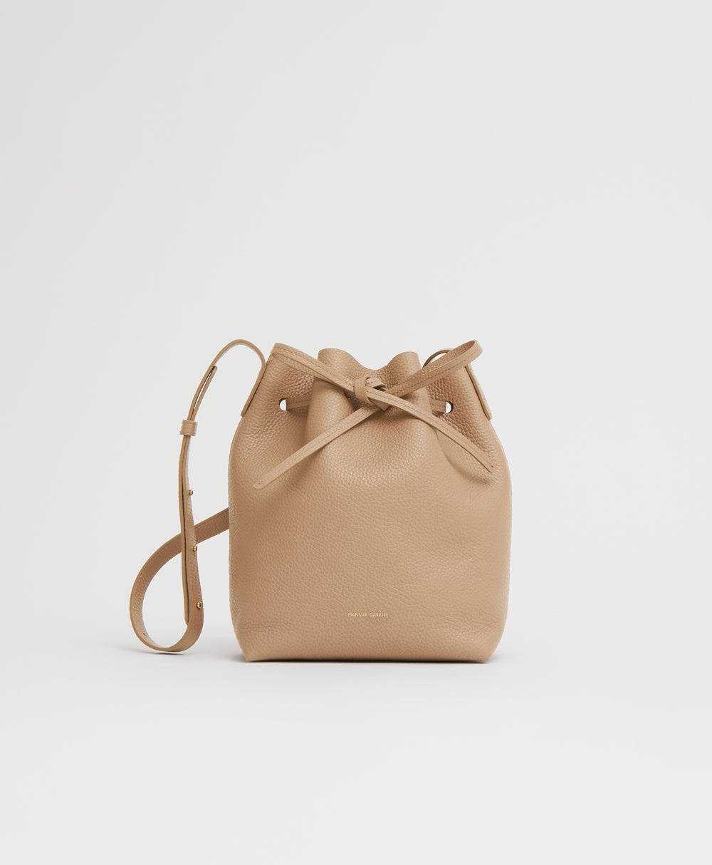 The Mini Bucket's iconic form is refined this season into a softer, more supple version. Embracing a gentle slouch and softer leather, it retains classic features like an adjustable strap and drawstring closure, becoming a modern classic. Details Width: 7.1 in / 18 cm Height: 9.8 in / 25 cm Depth: 4.75 in / 12 cm Strap Drop: Max 24.5in / 62.2 cm - Min 17.5in / 44.5cm Composition: 100% Italian Pebbled Leather Made in Italy Materials Our Italian Pebbled Leather is an ultra soft, textured leather with a soft hand feel. The tumbling process used on this leather creates a more durable material that is less prone to scratching and wear.