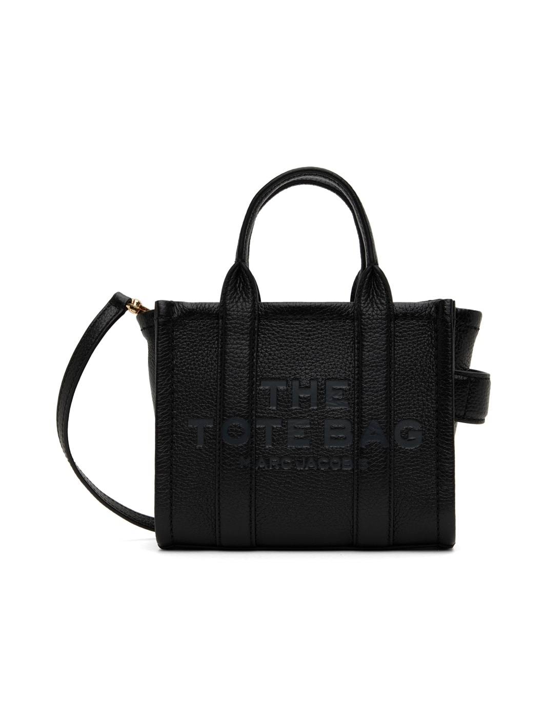 Grained leather tote in black. · Twin rolled carry handles · Adjustable and detachable crossbody strap · Logo embossed at face · Carry handle at side · Logo patch at back face · Zip closure · Unlined · H6" x W7" x D4" Supplier color: Black