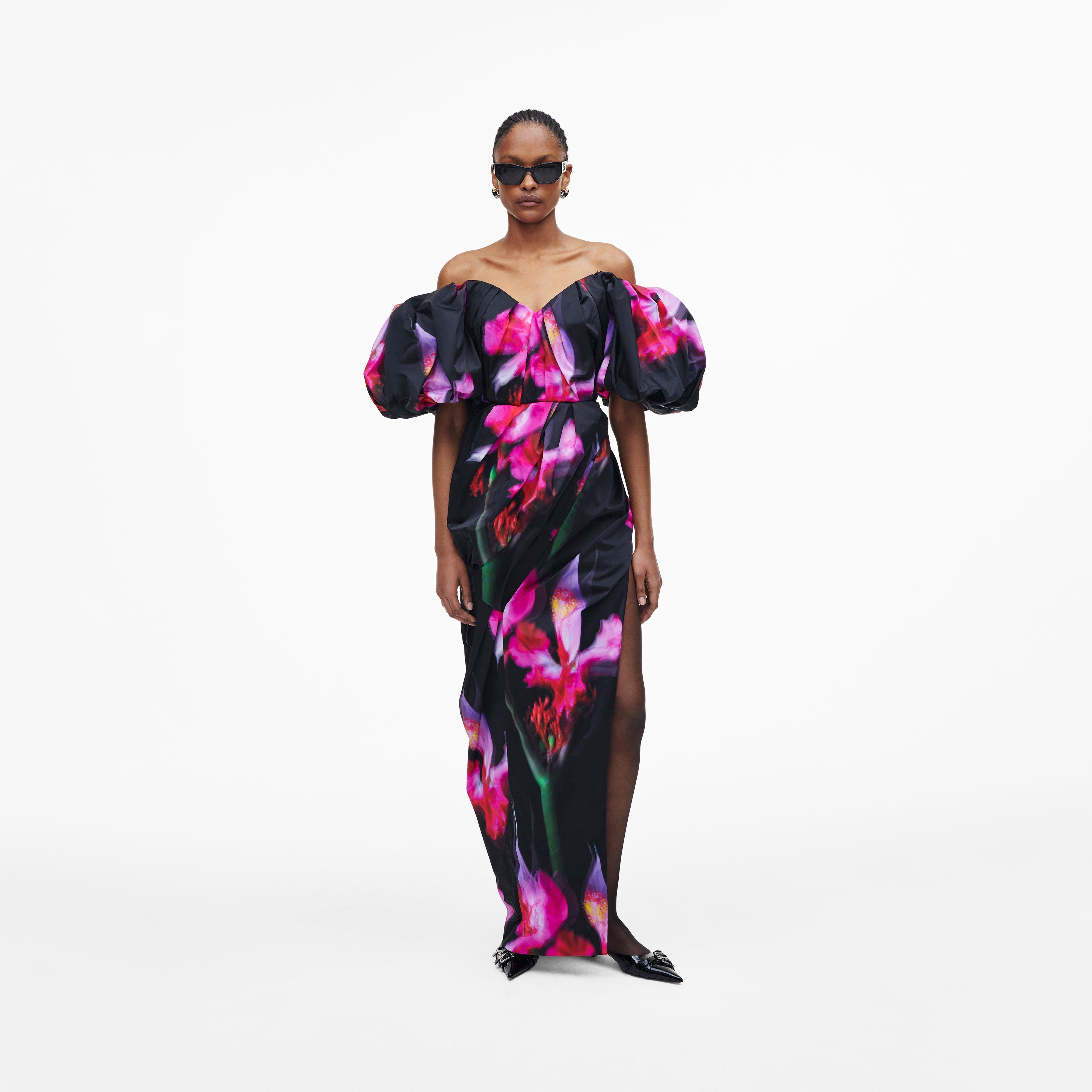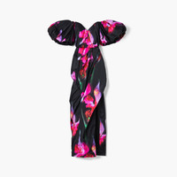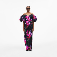 A stunning evolution of the voluminous layers shown on the runway, this statement-making gown spotlights the stunning work of floral photographer Brandy Kraft. The image is layered onto satin taffeta and scaled to oversized proportions for a striking finish. Each dress features bubble sleeves, flattering pleating, and a high left leg slit. 2S4RDR011W01 FEATURES 100% Nylon Back zipper