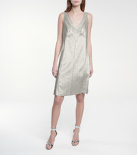 Dazzle your way through party season in this silver minidress from Marc Jacobs. Made from lightweight gabardine woven with lamé for a lustrous metallic sheen, it's cut to a minimalist shift style that's shaped with pressed creases and darts. Show off the thigh-skimming hemline with knee-high boots. - material: 88% viscose, 7% polyester, 5% polyamide - lining: 100% silk, fully lined - care instructions: dry clean - Made in the USA - Designer colour name: Chalk - Runs large, please see Size & Fit tab