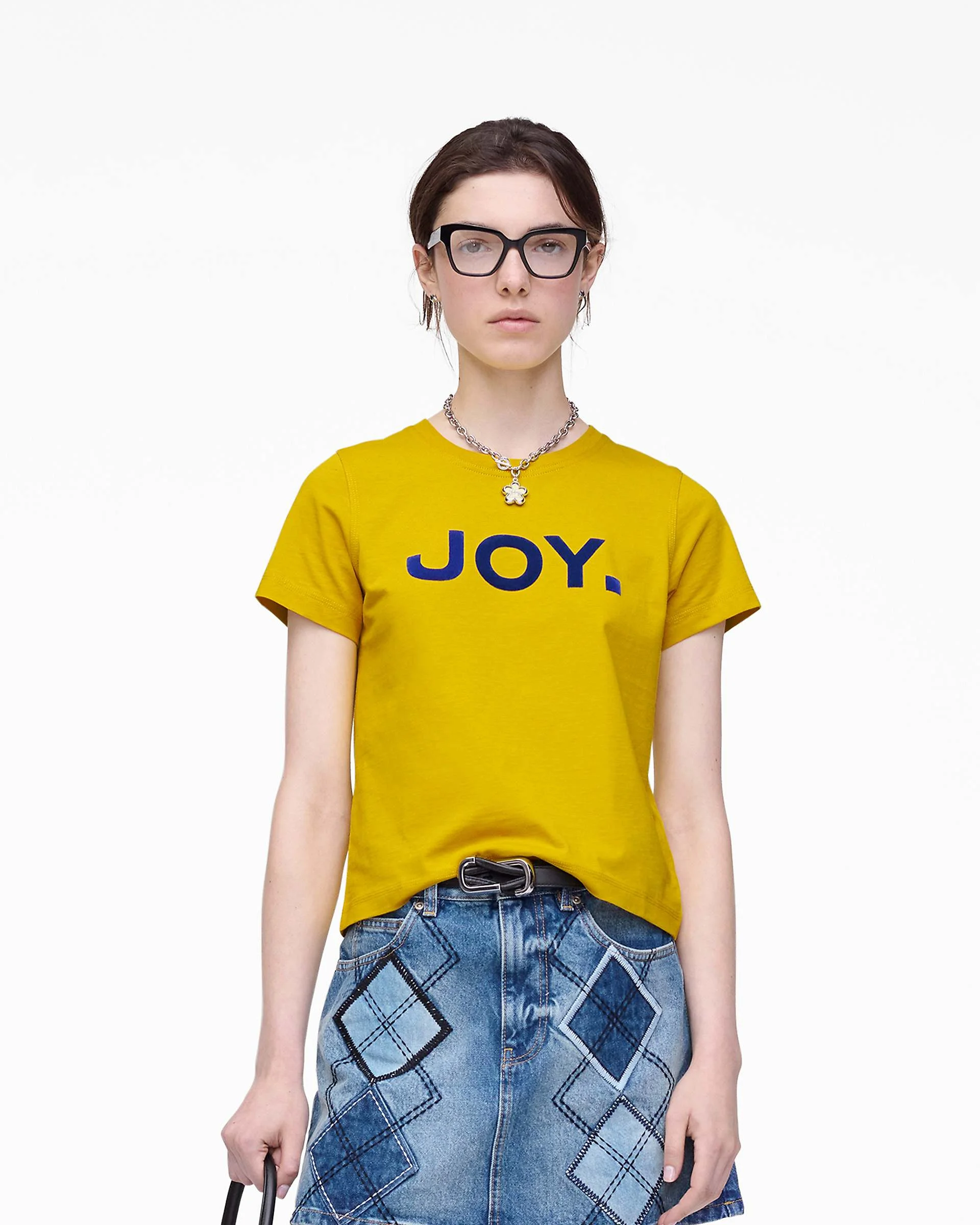 Description Made from lightweight stretch jersey and channeling our seasonal JOY theme, this slim tee features a bold “JOY.” graphic at the front, and a ribbed neck trim for a refined finish. At the back, Marc’s personal show notes are screen-printed, offering a behind-the-scene glimpse into the collection’s spirit. 2F5RTP081C22 Features 100% Cotton Sizing Standard fit. Fits true to size. Men may want to size up. Model in Yellow and Dark Plum is wearing size Small Height: 5'10" 1/2 Bust: 31.5" Waist: 23" Hips: 34" Model in White is wearing size Small Height: 5'9" 1/2 Bust: 31" Waist: 23" Hips: 34"