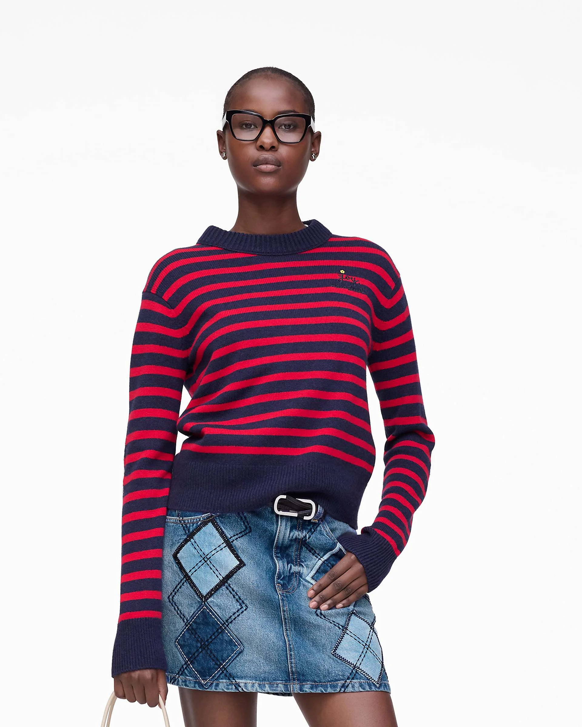 Description Playful yet polished, the Joy Striped Crewneck captures Marc’s signature irreverence in a classic silhouette. Knitted from a luxurious wool-cashmere blend, it features bold chest embroidery reading “JOY” and “MARC JACOBS.” Accented with hand-embroidered daisy elbow patches for a crafted touch. The double-knit collar, cinched cuffs and cinched hem bring structure to this cozy essential - an everyday piece with runway-worthy charm. 2F5RTP003K10 Features 90% Wool, 10% Cashmere Sizing Standard fit. Fits true to size. Designed to have a more relaxed fit. Model in Camel/Pansy is wearing size Small Height: 5'9" 1/2 Bust: 31" Waist: 23.5" Hips: 34" Model in Navy/Red is wearing size Small Height: 5'9" 1/2 Bust: 31" Waist: 23" Hips: 34" Model in Black/White is wearing size Small Height: 5'10" 1/2 Bust: 31.5" Waist: 23" Hips: 34"