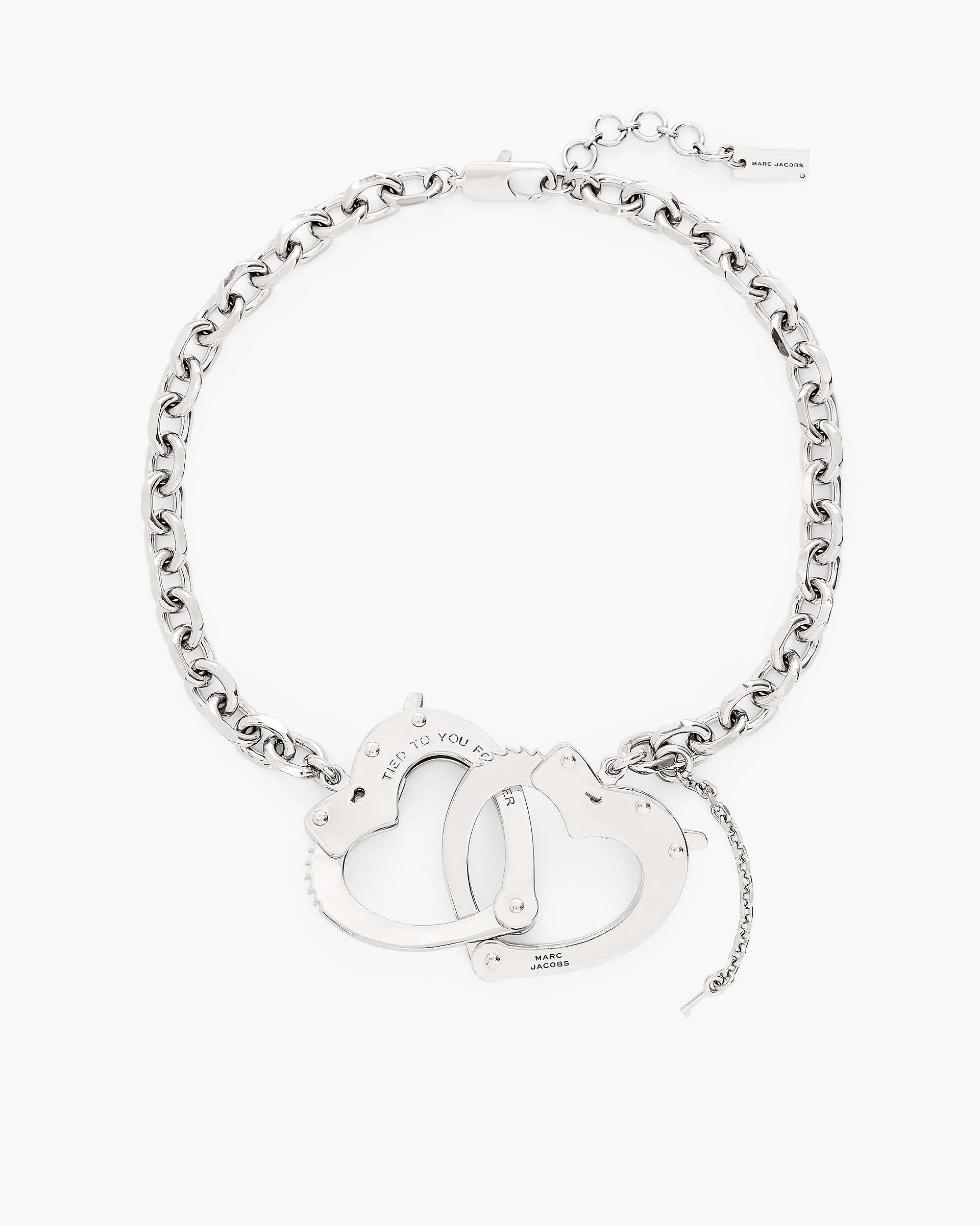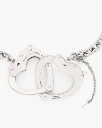 Description A sculptural statement with a playful edge, this bold necklace features interlocking heart-shaped handcuffs engraved with “TIED TO YOU FOREVER." Cast in high-shine metal with a sleek, substantial feel and a functional hinge closure at the cuff - it balances romance and rebellion in equal measure. 2R5JNC001J69 Features Plated Brass 100% Nickel Free Lobster Clasp Closure With Extender Chain Shipped In Our Signature Yellow Gift Box With Custom Monogram Dust Bag Dimensions Base Length: 18" (41cm) Extender: 3.5" (5cm) Pendant Cuffs: 44mm Each Small jewelry dust bag 4 x 4"