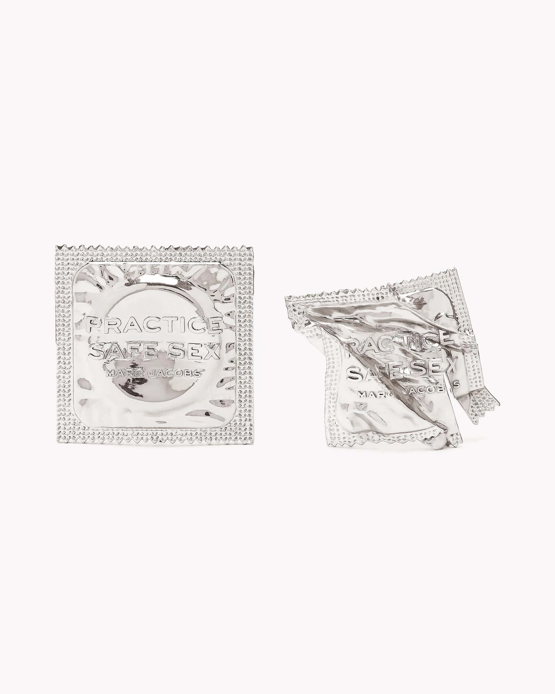 Description These asymmetrical condom earrings are made to spark conversation (and maybe a little fun). A statement earring crafted for bold styling, they bring playful - and responsible - disruption to any look. One earring’s “torn” open, the other’s still sealed - both cheekily reinforcing the message: PRACTICE SAFE SEX. 2R5JER001J18 Features Plated Resin 100% Nickel Free Omega Clip Closure Shipped In Our Signature Yellow Gift Box With Custom Monogram Dust Bag Dimensions 35mm X 41mm Small jewelry dust bag 4 x 4"