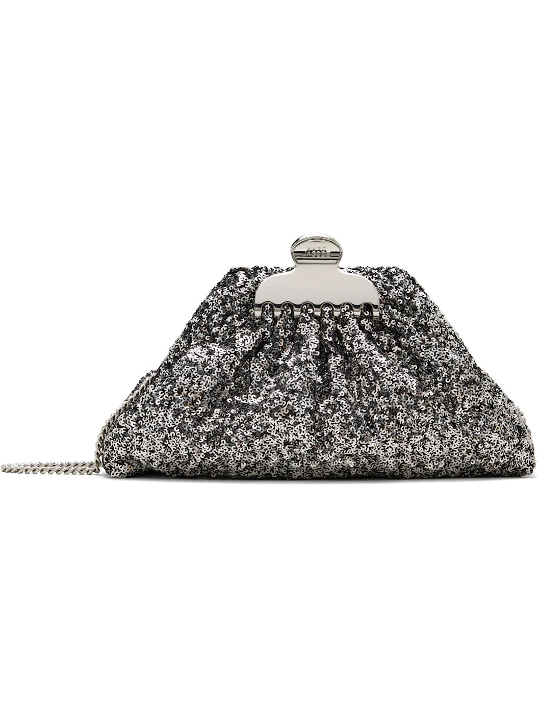 Sequinned textile clutch. · Detachable curb chain crossbody strap · Magnetic closure with logo-engraved graphic hardware · Nappa leather lining · H7" x W10" x D3" Part of THE™ collection. Supplier color: Silver Textile. Made in Philippines 261190F044004