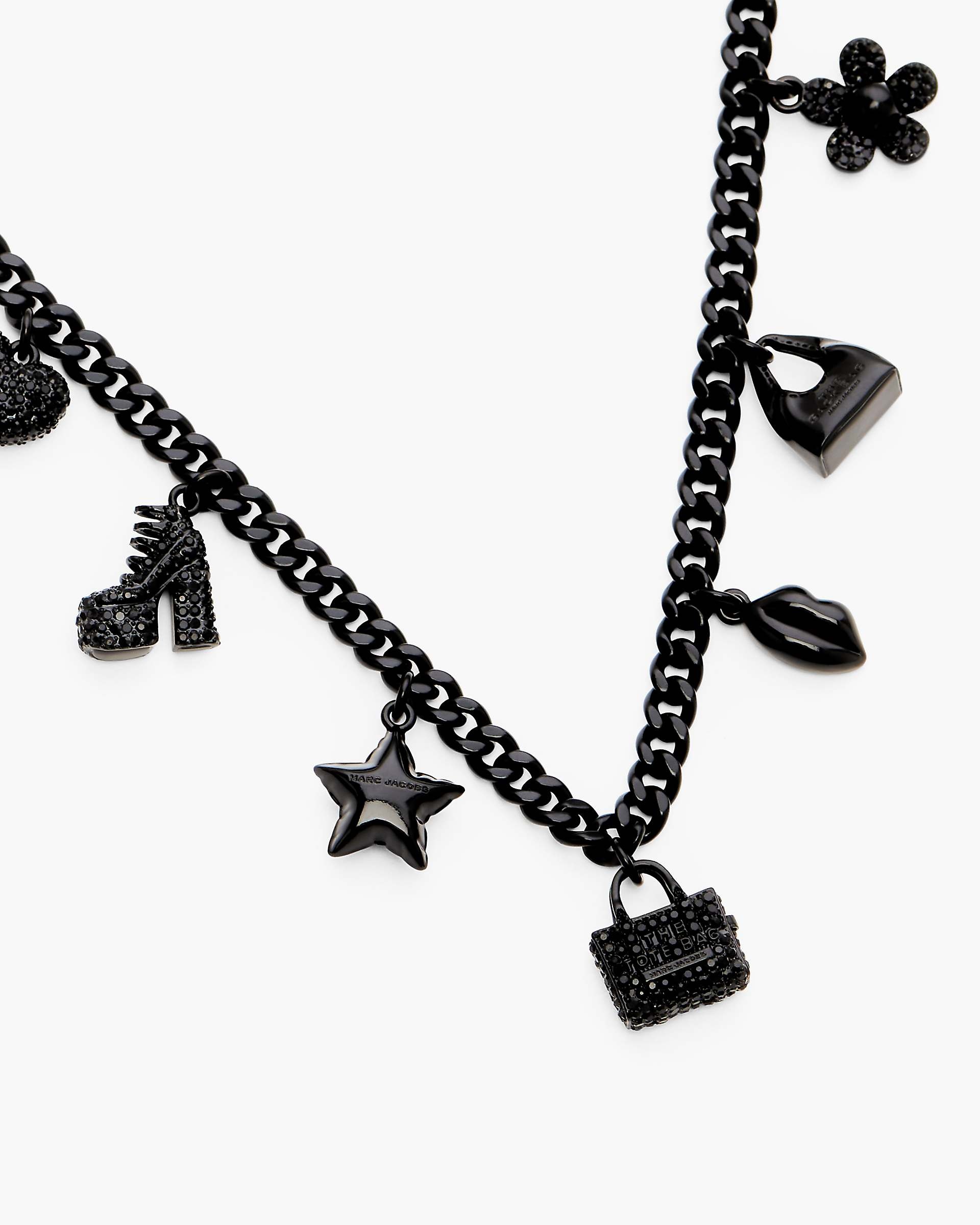 Description Our bestselling Mini Icon charms reimagined in glamour-forward crystals. This shimmering, elevated take on our signature necklace features mini iterations of iconic Marc Jacobs silhouettes and design elements, and an adjustable chain for a personalized fit. 2R4JNC001J49 Features Plated Brass Glass Stones 100% Nickel Free Lobster Clasp With Extender Chain Shipped In Our Signature Yellow Gift Box With Custom Monogram Dust Bag Dimensions Shorter Length: 60cm Longer Length: 65cm Pendant: 20mm wide