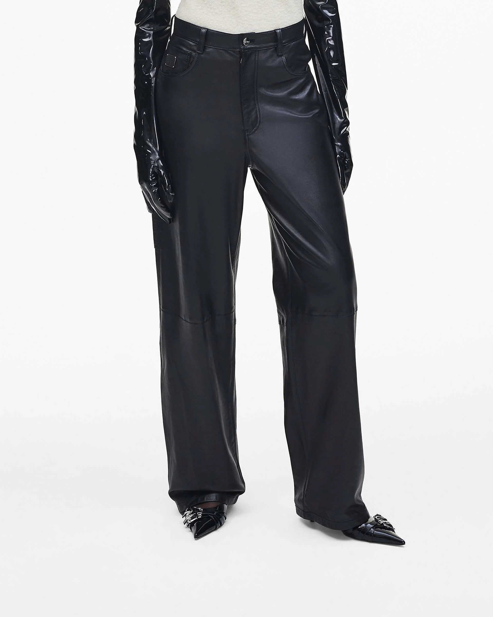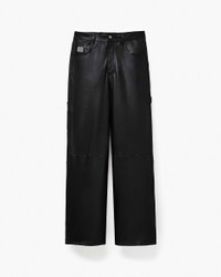 This version of our oversized carpenter jeans is reimagined in supple lambskin leather. Each pair is designed to sit at a low waist, cut for a slouched fit, and finished with an “M” embroidery on each back pocket. 2S4RBT003W03 FEATURES 100% Lamb Leather Barcode metal plaque Leather barcode patch Branded shank buttons