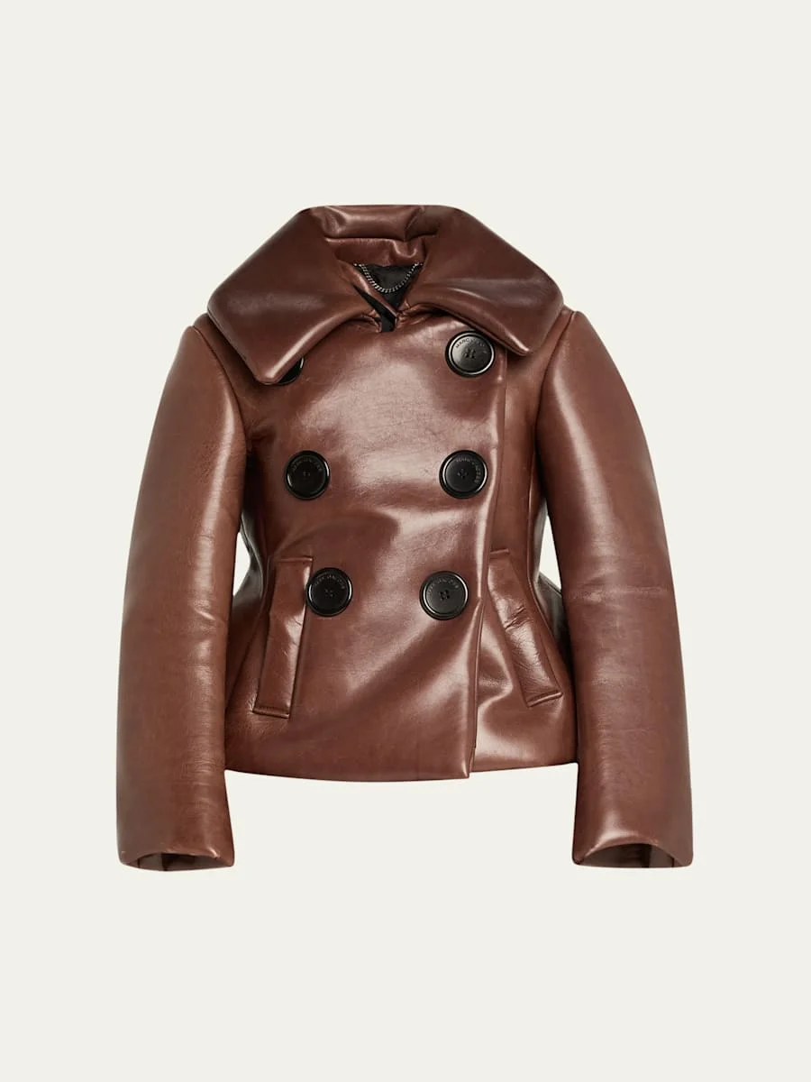 From the Spring '25 Collection, this Marc Jacobs Runway shrunken jacket is sculpted from padded supple calfskin leather and is defined by a figure-flattering cinched waist Spread collar with throat latch; double-breasted front Long sleeves Hip welt pockets Slim fit Button-tab back Hip length Button closure Leather/polyurethane Fill: Polyester Made in USA Online Inquiries: BGS21_BAC2X| Store Inquiries: #5047921