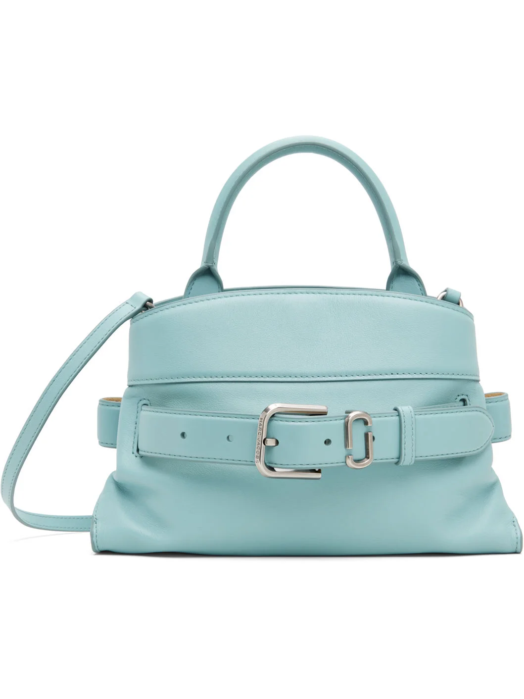 Grained leather top handle bag. · Rolled carry handle · Adjustable and detachable crossbody strap · Pin-buckle strap with logo hardware at face · Logo embossed at back face · Bumper studs at base · Magnetic closure · Two-compartment interior · Zip pocket at interior · Faille lining · H7" x W10.5" x D4" Part of THE™ collection. Supplier color: Sky Blue Leather. Made in Viet Nam 261190F046005