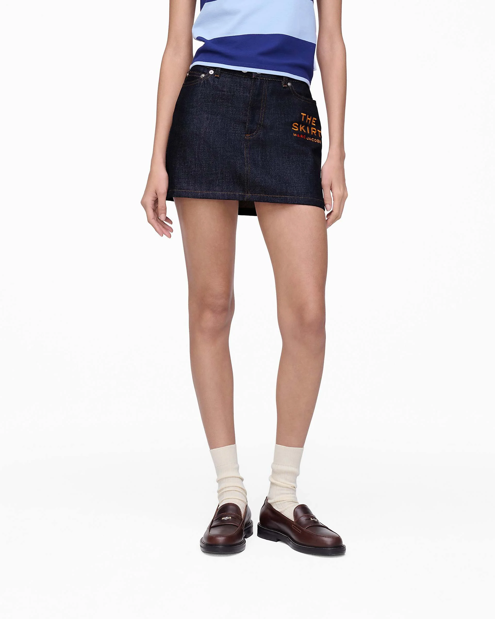 Description Crafted from classic denim, designed in a timeless mini silhouette. Crisp lines meet caramel topstitching, while “THE SKIRT” embroidery at the pocket adds that perfect hint of je ne sais quoi. Finished with a timeless button-and-zip closure. 2F5RSK051D11 Features 100% Cotton "The Skirt" Embroidery Zipper Fly Tack Button Closure Sizing True to size Eduarda - 36
