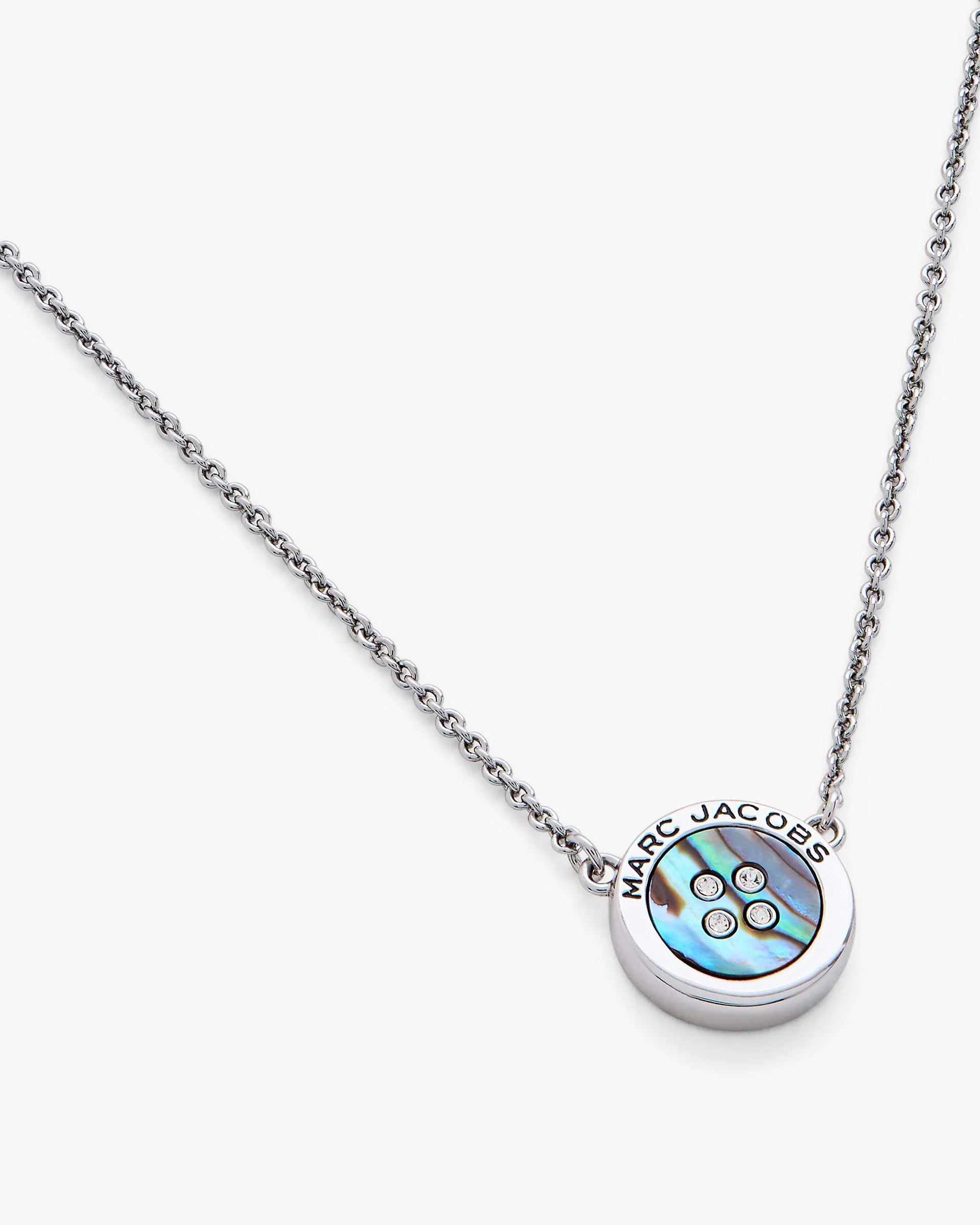 Description Inspired by Marc’s love of trims and detailing, Marc Jacobs celebrates the little things with this elevated Button Necklace. Crafted in shimmering abalone and embellished with crystal accents, this tastefully playful design features refined signature logo branding for an elegant touch. Pair with our Button Stud Earrings for effortlessly chic day-to-night styling. 2S5JNC001J21 Features Plated brass Abalone with glass stones 100% Nickel free Lobster clasp with extender chain Shipped in our signature yellow gift box with custom monogram dust bag Dimensions Shorter length: 16" (41cm) Longer length: 18" (46cm) Button pendant: 0.5" (1.4cm) round