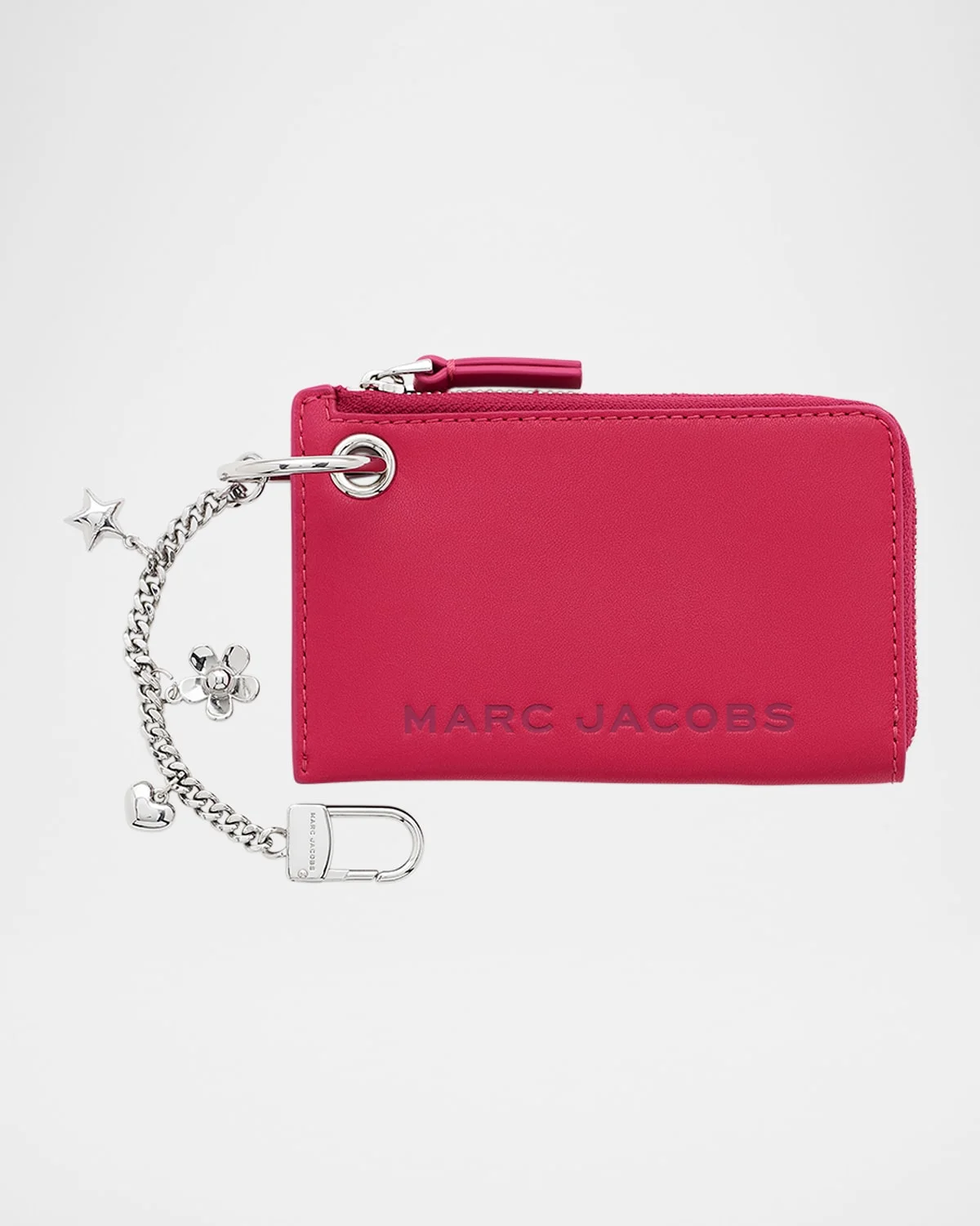 - Luxuriously crafted in butter-soft smooth leather, the charm top zip wallet is ornamented with a dangling dog clip chain for effortless and eye-catching key storage, featuring three notably iconic Marc Jacobs charms: a balloon star, a daisy, and a heart. With a secure top-zip closure and internal slip pocket for no-fuss organization, attach to your belt loop or favorite handbag for easy access to your keys, cards, cash, and all your precious essentials. - Marc Jacobs smooth leather coin case with embossed signature lettering logo - Zip top closure - Exterior, charm chain D-ring strap - Approx. 3.5"W x 1.2"H - Spot clean - Imported