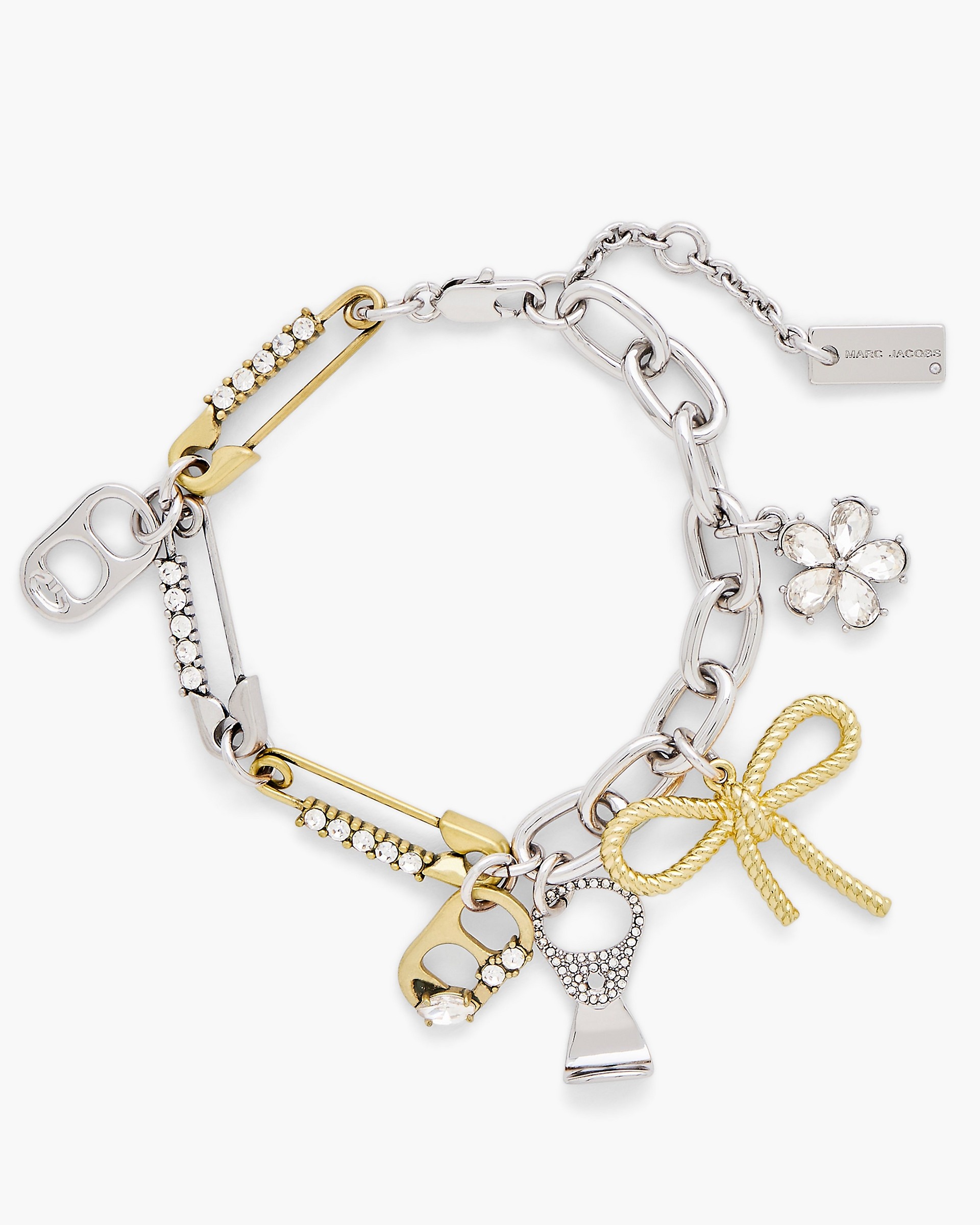 Description An ode to the grunge-inspired origins of Marc’s early archival designs, this refined chain link bracelet features playfully elevated punk-influenced charms, including a soda can pull-tab, safety pin chain links and more. A silhouette that shines in its details, adorn yourself with its effortless lobster clasp closure for a personalized fit. 2S5JBR001J43 Features Plated brass Glass stones 100% Nickel free Lobster clasp with extender chain Shipped in our signature yellow gift box with custom monogram dust bag Dimensions Base length: 7" (18cm) Extender: 1" (3cm) Charms: 15-23mm