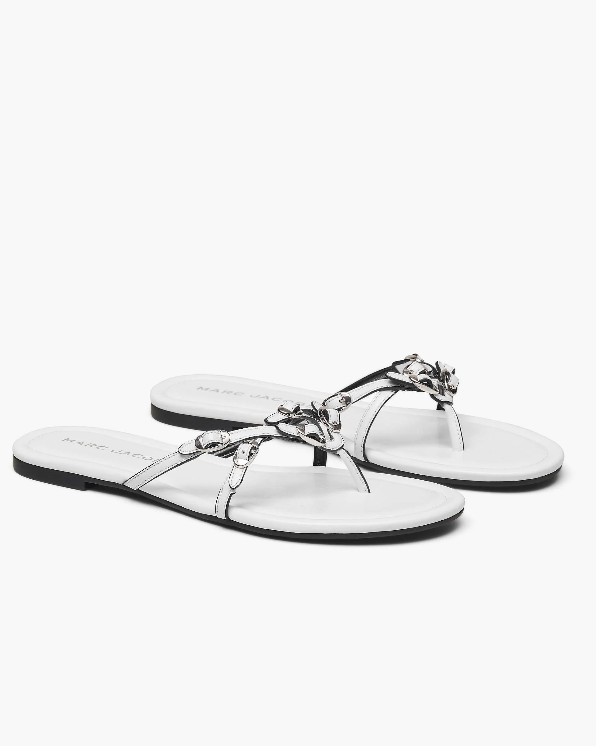 Description Inspired by Marc's runway, this multi-strap thong sandal has dainty, yet edgy, fixed Kiki buckle detailing on crinkled leather straps. A padded footbed and flexible rubber outsole make for comfortable all-day wear. 2S6FSA001F06 Features Leather Upper Rubber Sole Leather Footbed Dimensions 8mm heel height 5mm pitch