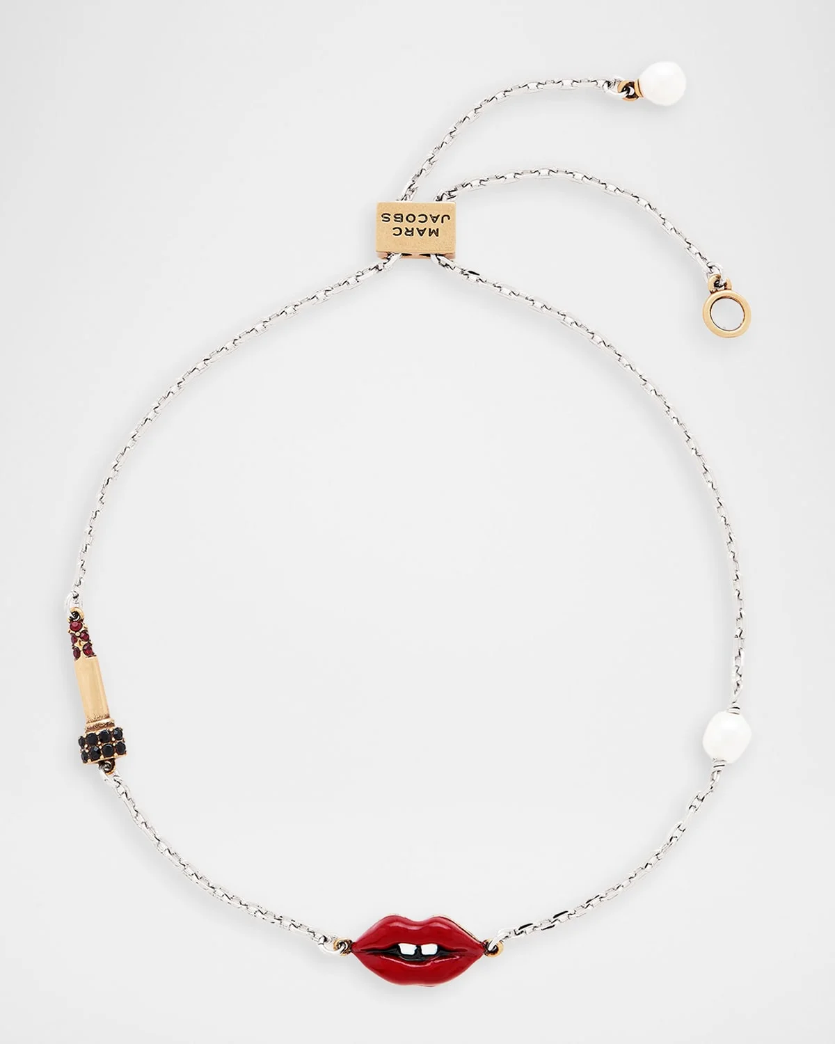 This soft chain bracelet from Marc Jacobs has a playful feel with red lips, pave crystals, and a pearly accent. Approx. 12mm lips; 1.5 chain width Shiny brass Enamel Glass crystals Pearly glass bead Adjustable length Slider clasp Imported