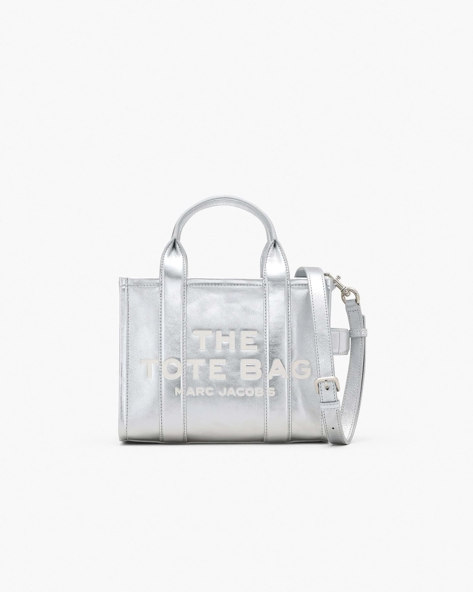 This version of our Small Tote is crafted in striking silver leather. A chunky top zip closure, one slip pocket, one card slot and the namesake debossed branding make the small tote a perfect compact plus one. Carry yours by the top handles or attach the adjustable, removable crossbody strap for hands-free styling. 2F3HTT004H01 FEATURES Metallic leather Top zip closure Top handle, removable and adjustable leather strap 1 zip pocket, 1 slip pocket Faille lining Dust bag included DIMENSIONS 10in L x 5in D x 8in H 26cm L x 13cm D x 21cm H Strap 57in L x 2in D (144cm L x 4cm D) Strap Drop 27in (69cm) Handle Drop 4in (11cm)