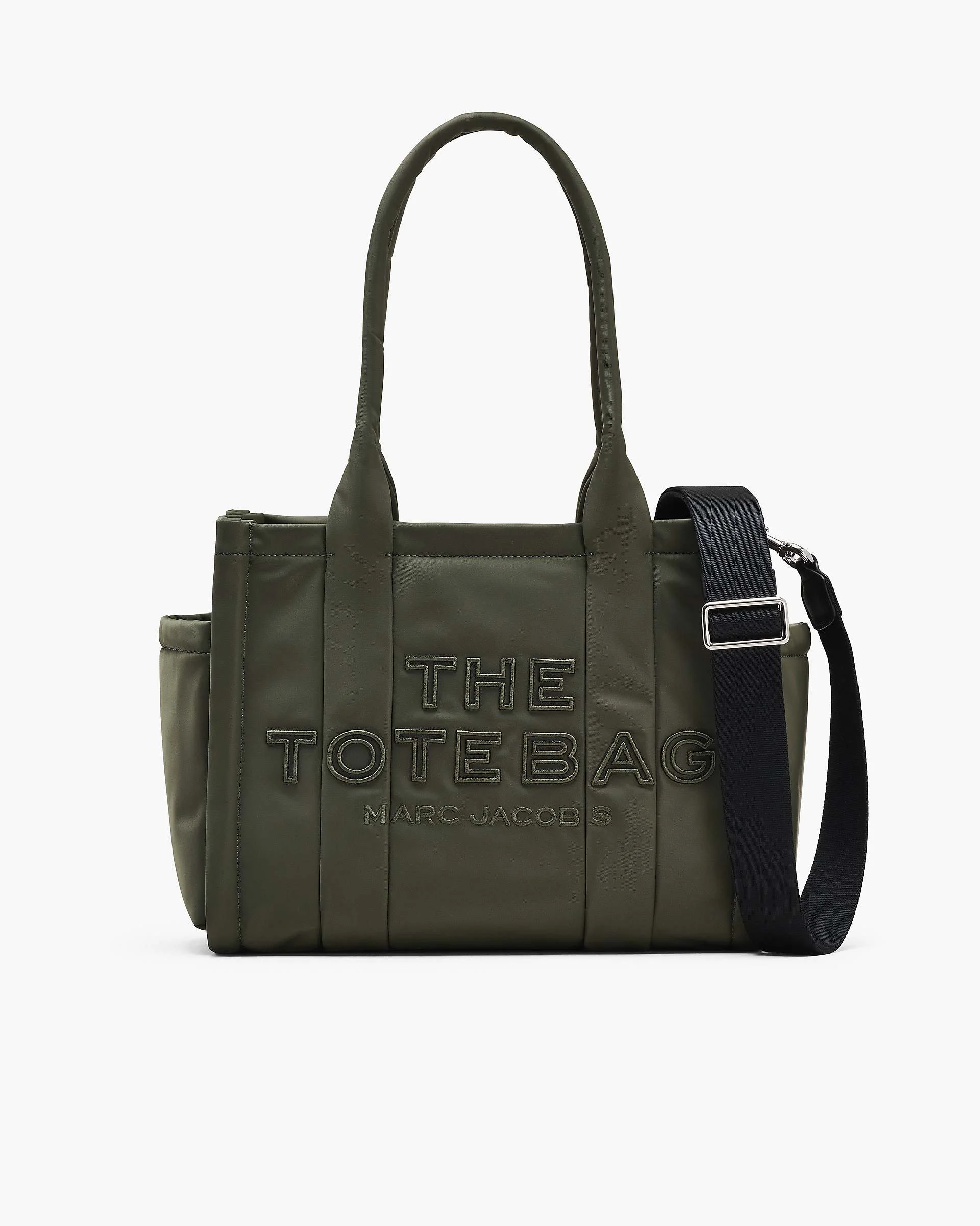 Description Our iconic medium Tote Bag silhouette reimagined in puffy nylon, this sporty utility-inspired carryall features a refined top handle for high-comfort over-the-shoulder styling, an embroidered iteration of our signature namesake branding and a top zip closure. With two external side pockets, one interior slip pocket and one interior zip pocket, this ultra accommodating silhouette includes pop lining with in an interior inscription that reads, "CAUTION EXTREMELY LIGHTWEIGHT BECAUSE LIFE'S TOO SHORT FOR HEAVY BAGGAGE. Part of THE collection. 2R4HTT016H03 Features Nylon Top zip closure Top handle 2 external side pockets 1 Interior Slip Pocket, 1 Interior Zip Pocket Polyester Lining Dimensions 13in L x 6in D x 11in H 33cm L x 15cm D x 26cm H