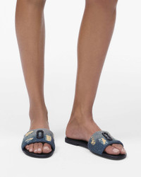 Description The perfect slide-on sandal for effortless style. Crafted in distressed denim and featuring a signature J Marc seal, its sleek, slim design ensures a lightweight, comfortable step for all-day wear. 2P5FSA001F20 Features Denim upper Rubber sole Leather footbed Slip-on 5mm heel 5mm pitch Narrow fit (3’’ / 85mm footbed width) We recommend sizing up