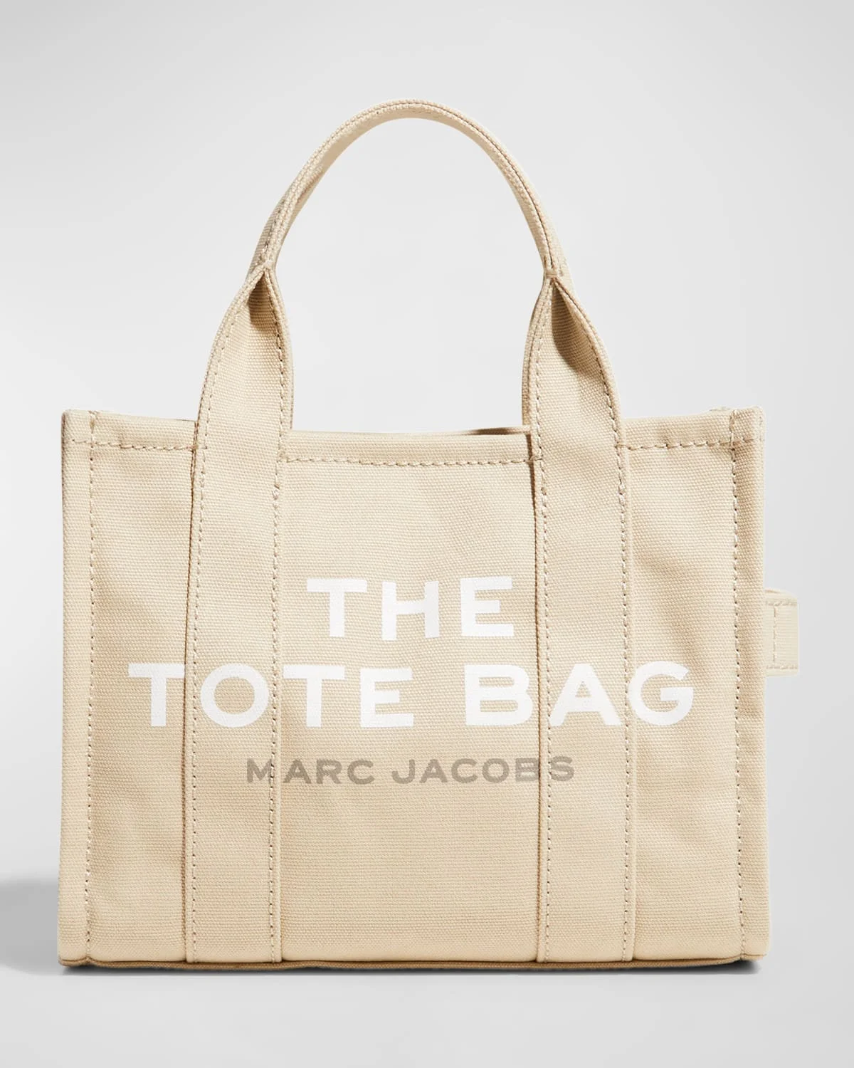 The Marc Jacobs "Traveler" logo tote bag in cotton canvas. Rolled top handles. Detachable, adjustable contrast web shoulder strap with 69cm/ 27" drop. Can be worn on the shoulder, across the body or as a handbag. Zip top closure. Exterior, straps at sides; logo patch at back. Dimensions: 8"H x 10"W x 5"D.
