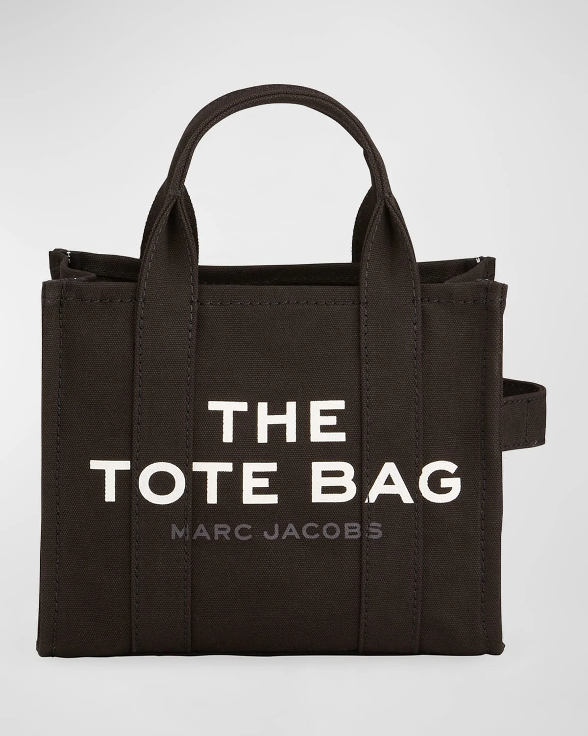 The Marc Jacobs "Traveler" logo tote bag in cotton canvas. Rolled top handles. Detachable, adjustable contrast web shoulder strap with 69cm/ 27" drop. Can be worn on the shoulder, across the body or as a handbag. Zip top closure. Exterior, straps at sides; logo patch at back. Dimensions: 8"H x 10"W x 5"D.