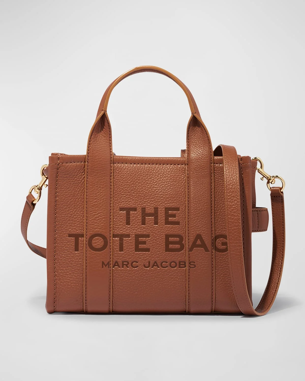 The Marc Jacobs logoembossed tote bag in calf leather Flat top handles, 4" drop Removable, adjustable crossbody strap, 51", 24" drop Zip top closure Exterior, side strap accent Interior, slip pocket Approx. 8"H x 10.25"W x 5.25"D Item weighs approx. 24 oz/0.68 kg. "Traveler" is imported