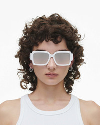 The signature branding from our most-loved tote bags is reimagined in these oversized square-framed sunglasses finished with mirrored lenses. M8000850 FEATURES Acetate frame and temple Shaded UV Protective Lens Compatible with Prescription Lens MARC JACOBS laser logo on lens Gray mirror shaded lens High relief colorblock logo on temples DIMENSIONS Lens Width: 55MM Bridge Length: 17MM Temple Length: 145MM