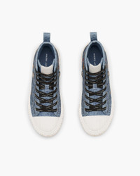 Description Our signature high-top sneaker gets a fresh update in printed denim canvas, featuring printed trompe l’oeil and three-dimensional studded charms - inspired by our seasonal Trinket collection. Staying true to the classic silhouette of THE Sneaker, it’s finished with a bold Daisy Yellow pop-sole and a monogrammed rubber outsole for unmistakable Marc Jacobs style. 2R5FSN001F06 Features Canvas Upper Rubber Outsole EVA + Textile Footbed Dimensions 1.4" (35mm) Heel .39" (10mm) Pitch