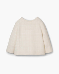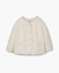 Description Inspired by iconic Marc Jacobs Runway silhouettes and classic textural tweed fabrications, this timelessly sophisticated and notably contemporary jacket is designed to wear two ways: snaps down the front, or snaps down the back. Featuring puffed binding detailing, a collarless round neckline and half-dome fabric covered button closures, this covetable piece has a cropped, shrunken fit for stylized elegance. Style with the Daisy Pave Brooch for a truly classic flair. 2S5RJC049W14 Features 38% Acrylic, 25% Cotton Silk Blend, 25% Polyester, 12% Viscose Metal barcode hanger loop Button closure Puffy binding at neck, centerfront, and cuffs, patch pockets at waist, half dome self covered shank snap buttons at placket and pockets Sizing Fits true to size. Sleeves are meant to be bracelet length and hem will hit just under the waist Taken from size S bust 39.5" length 21.3" sleeve length 22.0"